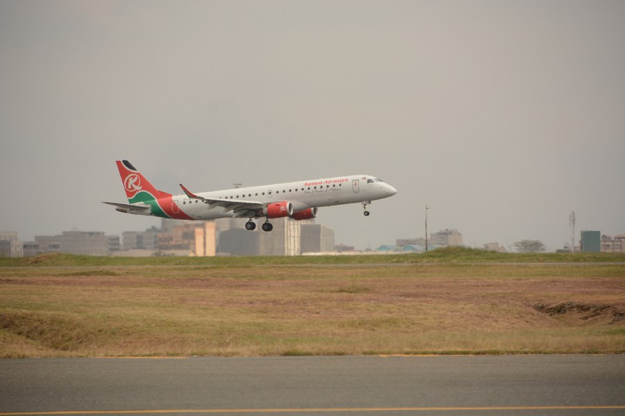 This photo taken on Aug. 1, 2020 shows a Kenya Airways plane arriving at Jomo Kenyatta International Airport in Nairobi, capital of Kenya. (Xinhua/Fred Mutune)