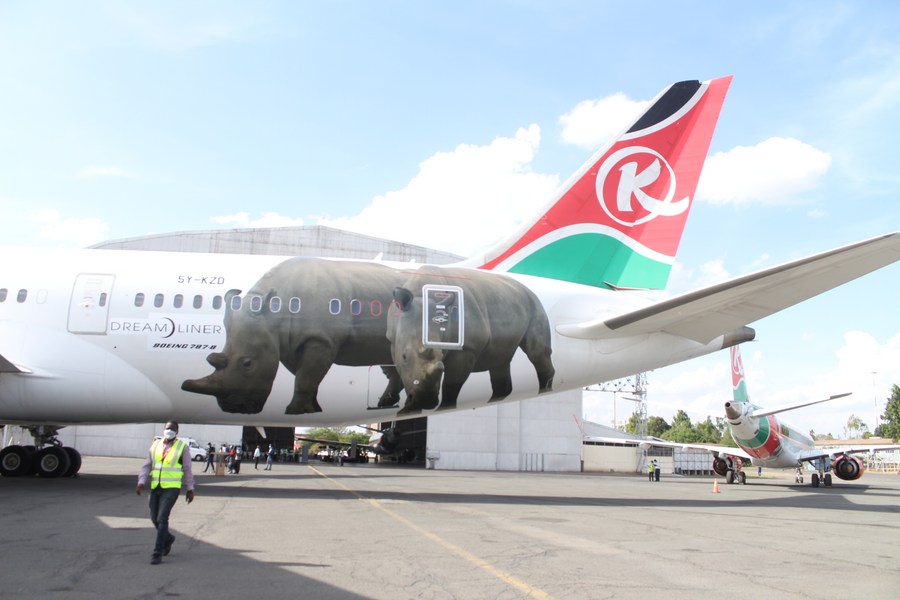 A worker is seen near a Kenya Airways passenger aircraft branded with images of rhinos in Nairobi, capital of Kenya, Nov. 25, 2021. (Photo by Joy Nabukewa/Xinhua)