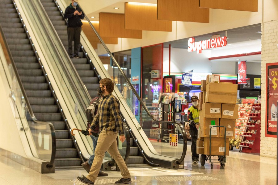 People wearing masks are seen in a shopping mall in Canberra, Australia, Oct. 15, 2021. (Photo by Chu Chen/Xinhua)
