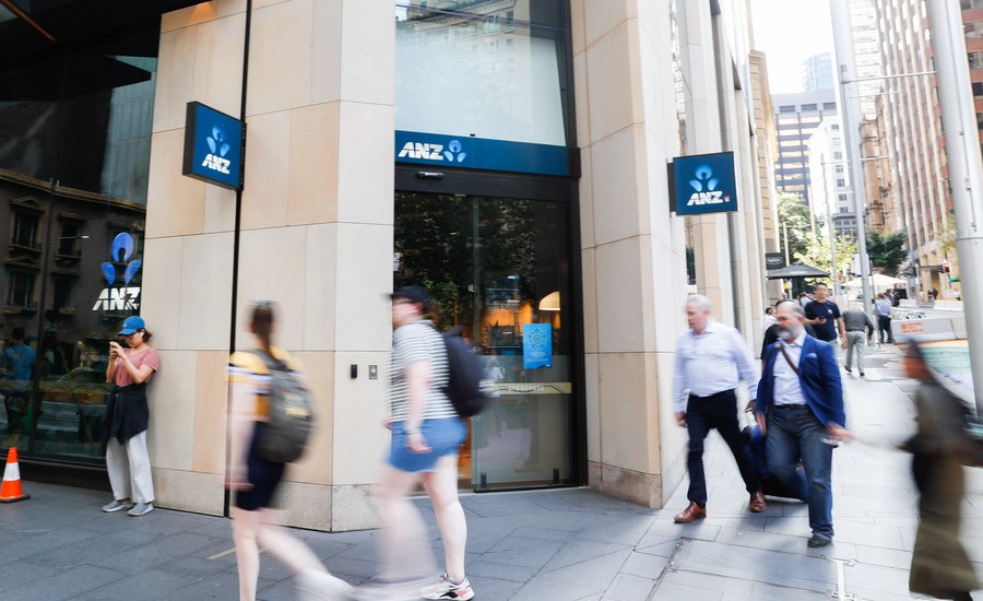 People walk outside a bank in Sydney, Australia, April 4, 2023. (Photo by Hu Jingchen/Xinhua)