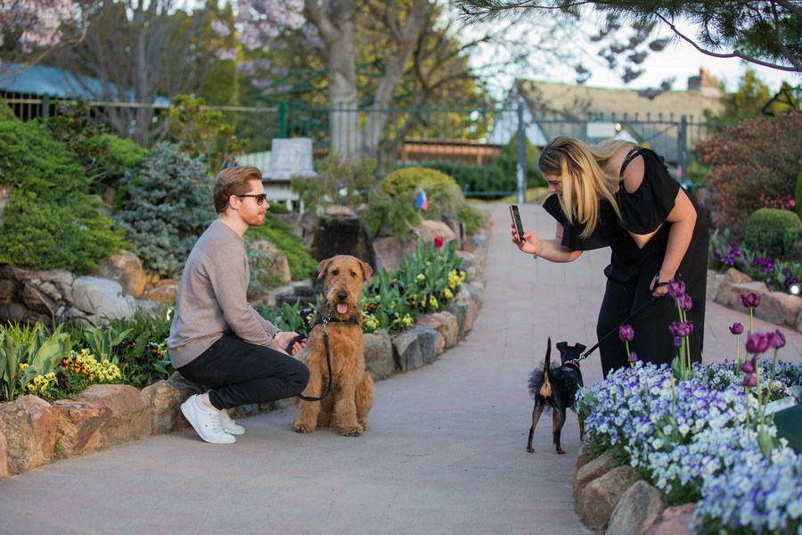 People take photos with their pet dogs during an annual flower festival Floriade in Canberra, Australia, Oct. 11, 2020. (Photo by Chu Chen/Xinhua)