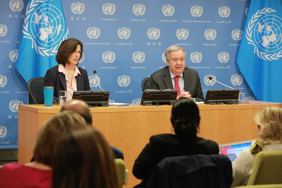 UN Secretary-General Antonio Guterres (R) speaks at a press conference at the UN headquarters in New York, June 12, 2023. (Xinhua/Xie E)