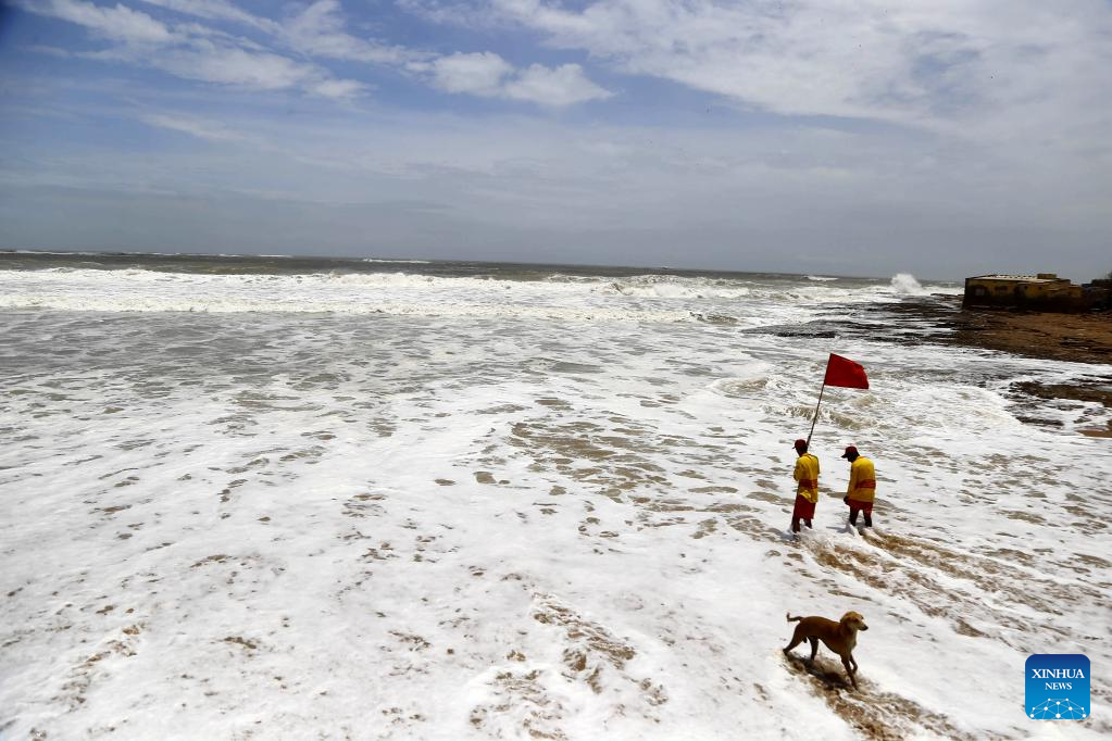 High tides are seen at a beach ahead of Cyclone Biparjoy in the southern Pakistani port city of Karachi, June 14, 2023. Pakistan will evacuate around 100,000 people as part of its efforts to ensure the safety of those living in the country's coastal area ahead of Cyclone Biparjoy, according to National Disaster Management Authority (NDMA) chairman Inam Haider Malik. (Str/Xinhua)