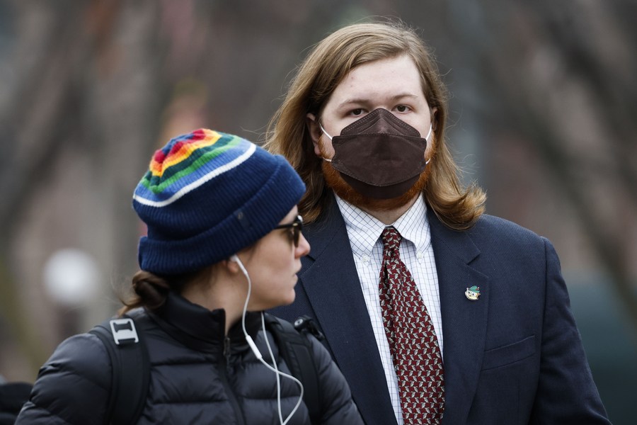 A man wearing a face mask is seen on a street in Washington, D.C., the United States, on Dec. 16, 2022. (Photo by Ting Shen/Xinhua)