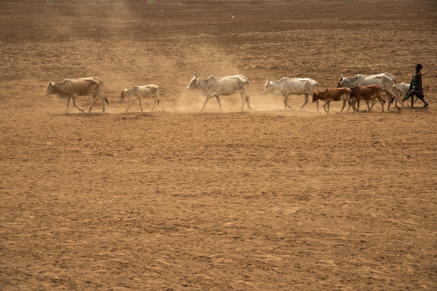 A herder moves with cattle in the drought-stricken Somali Region of Ethiopia, June 11, 2023. The adverse effect of climate change has further worsened the existing "widespread food insecurity" in the East Africa region. (Xinhua/Michael Tewelde)