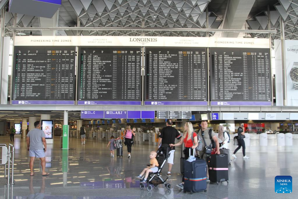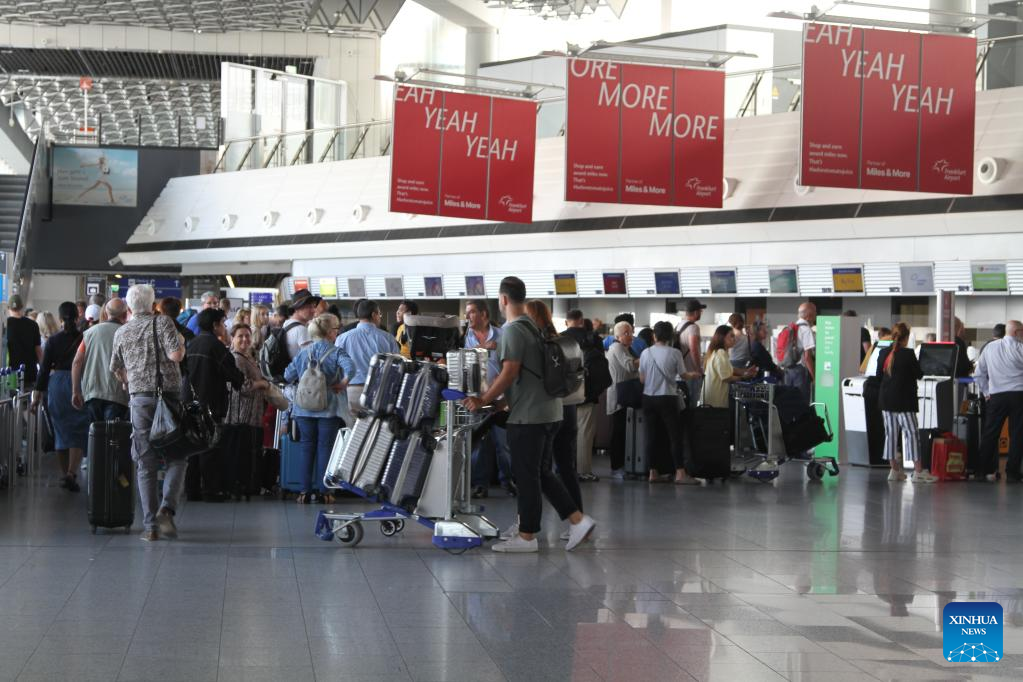 Passengers walk through the check-in area at an international airport in Frankfurt, Germany, June 12, 2023. A massive NATO exercise that kicked off on Monday is set to cause major disruptions to passenger flights in Germany, raising concerns from air travellers and also protesters. (Xinhua/Shan Weiyi)