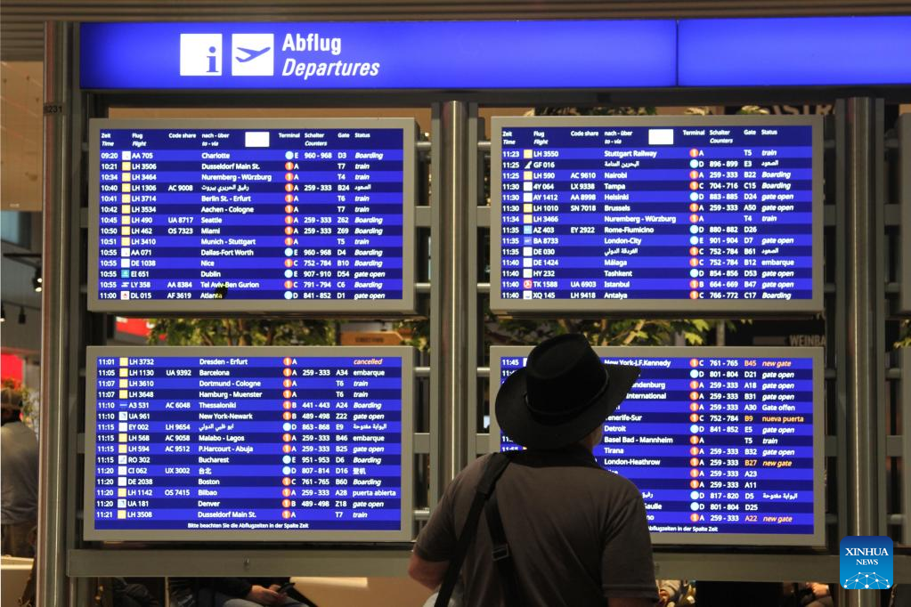 A man browses a bulletin of flight information at an international airport in Frankfurt, Germany, June 12, 2023. A massive NATO exercise that kicked off on Monday is set to cause major disruptions to passenger flights in Germany, raising concerns from air travellers and also protesters. (Xinhua/Shan Weiyi)