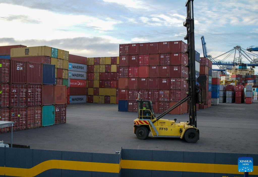 This photo taken on June 15, 2023 shows a view of a container terminal in Auckland, New Zealand. (Photo by Zhao Gang/Xinhua)