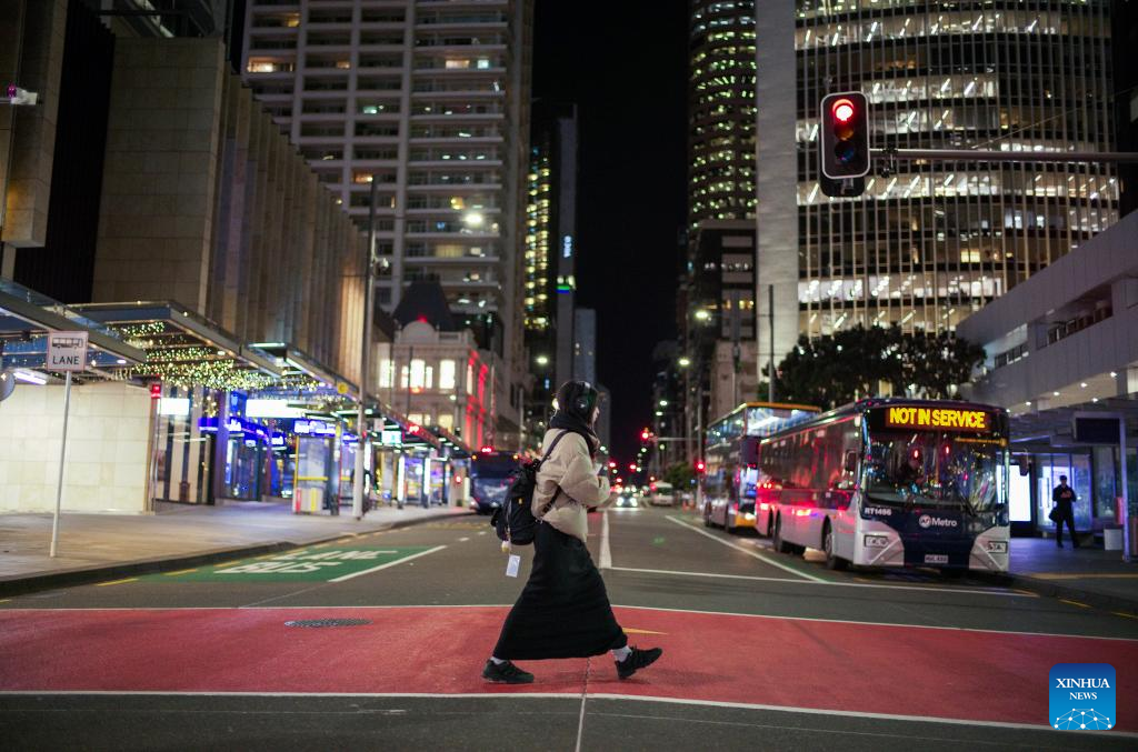 People wait for buses at a bus station in Auckland, New Zealand, June 15, 2023. (Photo by Zhao Gang/Xinhua)