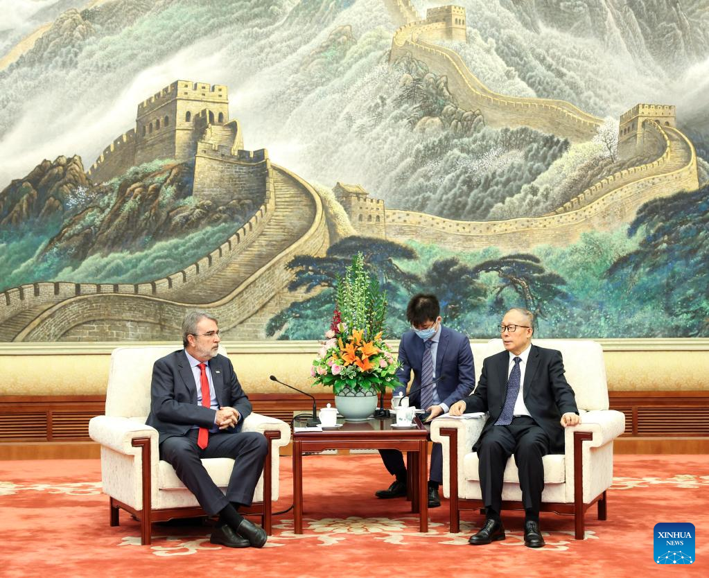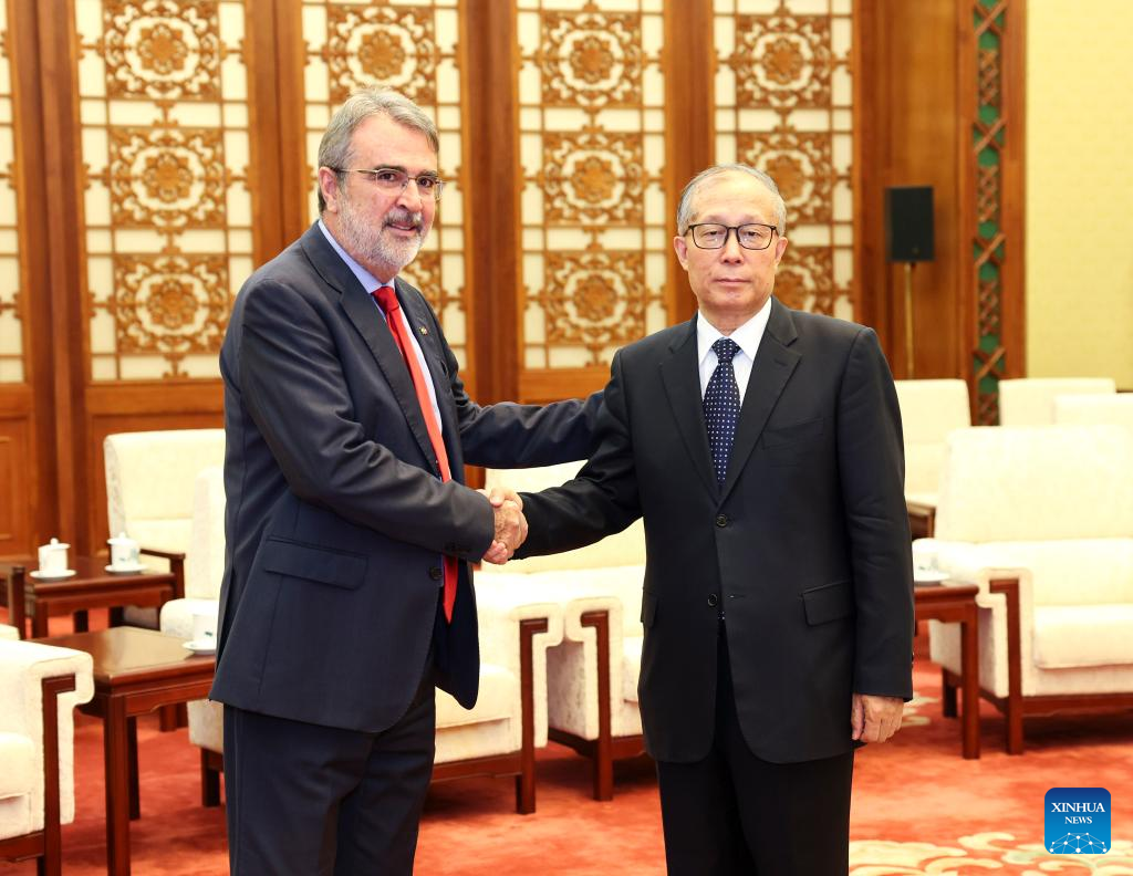 Li Hongzhong, vice chairman of the National People's Congress Standing Committee and a member of the Political Bureau of the Communist Party of China Central Committee, meets with a delegation of the Workers' Party of Brazil (PT) led by its general secretary Henrique Fontana in Beijing, capital of China, June 15, 2023. (Xinhua/Pang Xinglei)