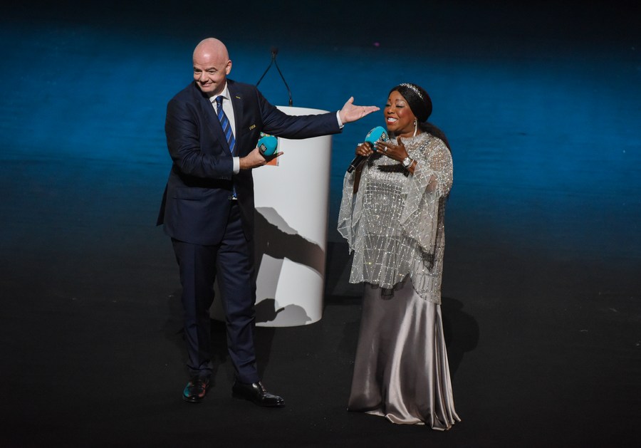 FIFA President Gianni Infantino (L) and FIFA Secretary General Fatma Samoura react during the draw ceremony for the 2023 FIFA Women's World Cup in Auckland, New Zealand, Oct. 22, 2022. (Xinhua/Guo Lei)
