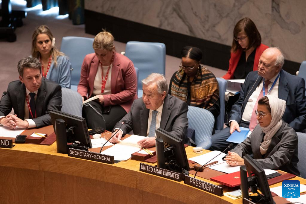 UN Secretary-General Antonio Guterres (C, Front) speaks at a Security Council meeting on "the Values of Human Fraternity in Promoting and Sustaining Peace" at the UN headquarters in New York, on June 14, 2023. (Xinhua/Xie E)