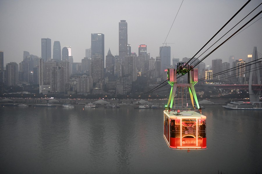 Photo taken on Dec. 23, 2019 shows a view of the cableway across the Yangtze River in southwest China's Chongqing Municipality. (Xinhua/Tang Yi)
