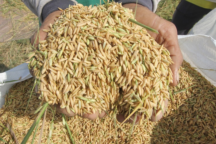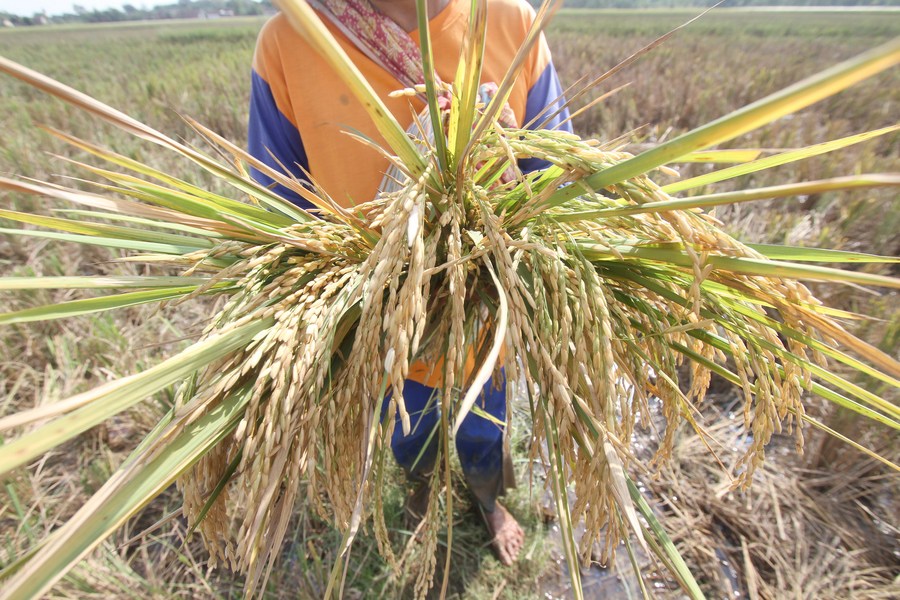 A farmer holds paddy after grinding during harvest time at the field in Majasto village, Sukoharjo district, Central Java Province, Indonesia on June 7, 2023. (Photo by Bram Selo/Xinhua)■