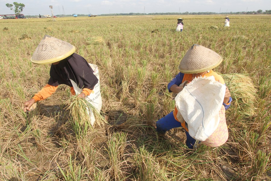Farmers harvest rice in Sukoharjo district in Central Java, Indonesia, June 7, 2023. (Photo by Bram Selo/Xinhua)