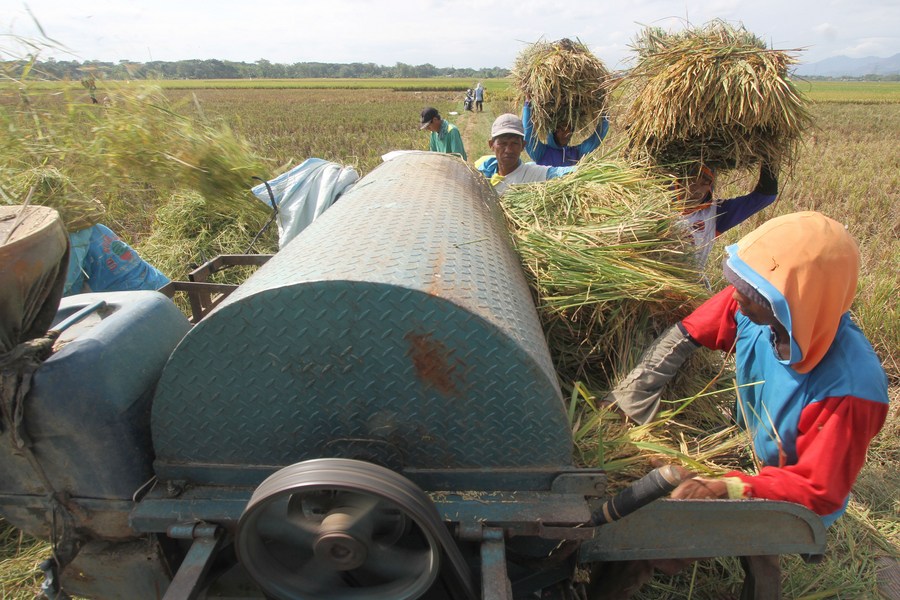 A farmer performs grinding paddy during harvest time at the field in Majasto village, Sukoharjo district, Central Java Province, Indonesia on June 7, 2023. (Photo by Bram Selo/Xinhua)