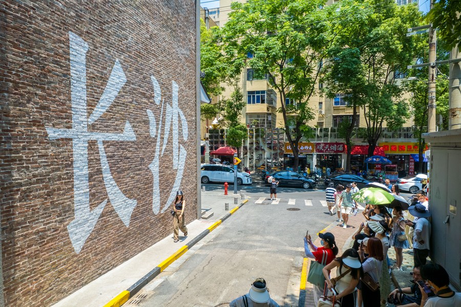 Tourists take photos in front of a brick wall bearing the Chinese characters for "Changsha" in Changsha, central China's Hunan Province on June 7, 2023. (Xinhua/Chen Sihan)