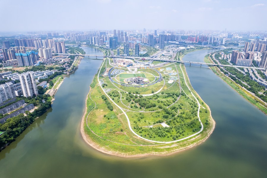 This aerial photo taken on June 7, 2023 shows a wetland park in Changsha, central China's Hunan Province. (Xinhua/Chen Sihan)