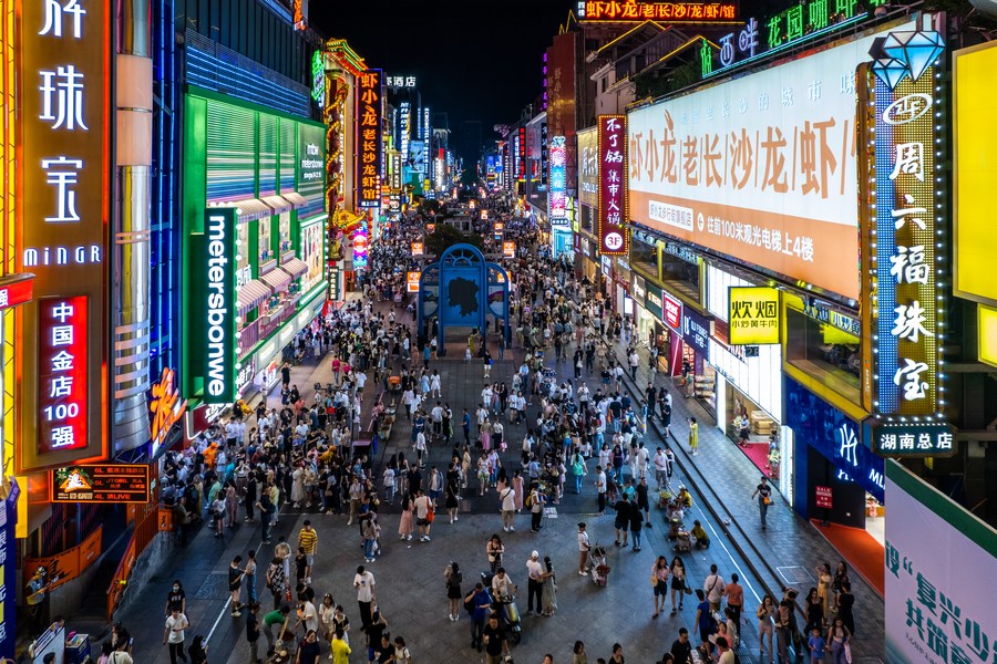 This aerial photo taken on June 7, 2023 shows tourists visiting the Huangxing Road in Changsha, central China's Hunan Province. (Xinhua/Chen Sihan)