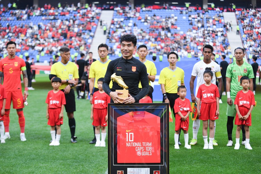 Zheng Zhi poses for photos during his retirement ceremony ahead of China's international friendly against Myanmar in Dalian, northeast China's Liaoning Province, June 16, 2023. (Xinhua/Long Lei)