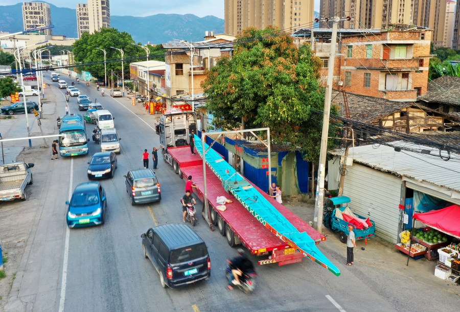This aerial photo taken on June 12, 2023 shows a dragon boat being loaded onto a truck in Minhou County, Fuzhou City, southeast China's Fujian Province. (Xinhua/Jiang Kehong)