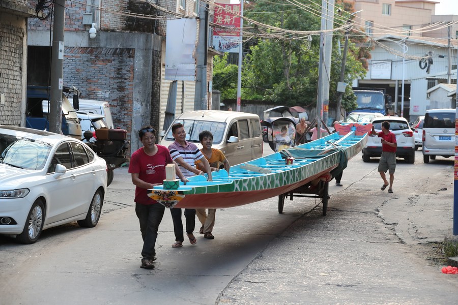 Villagers transport a dragon boat in Fangzhuang Village, Minhou County, Fuzhou City, southeast China's Fujian Province, June 12, 2023. (Xinhua/Jiang Kehong)