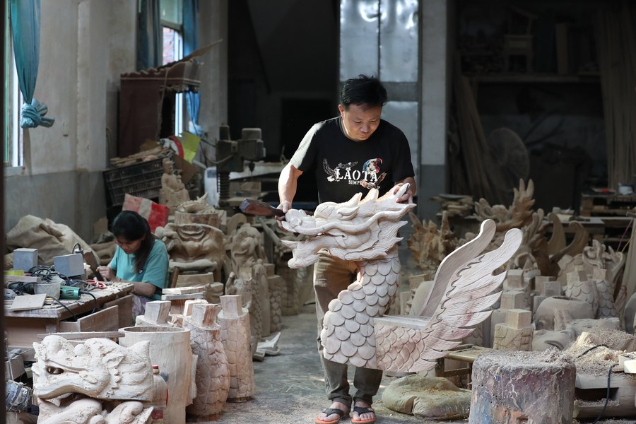 A craftsman carries a newly-carved dragon boat head in Fangzhuang Village, Minhou County, Fuzhou City, southeast China's Fujian Province, June 12, 2023. (Xinhua/Jiang Kehong)