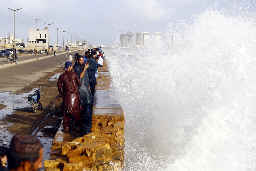 People view high tides at a beach ahead of Cyclone Biparjoy in the southern Pakistani port city of Karachi on June 14, 2023. (Str/Xinhua)