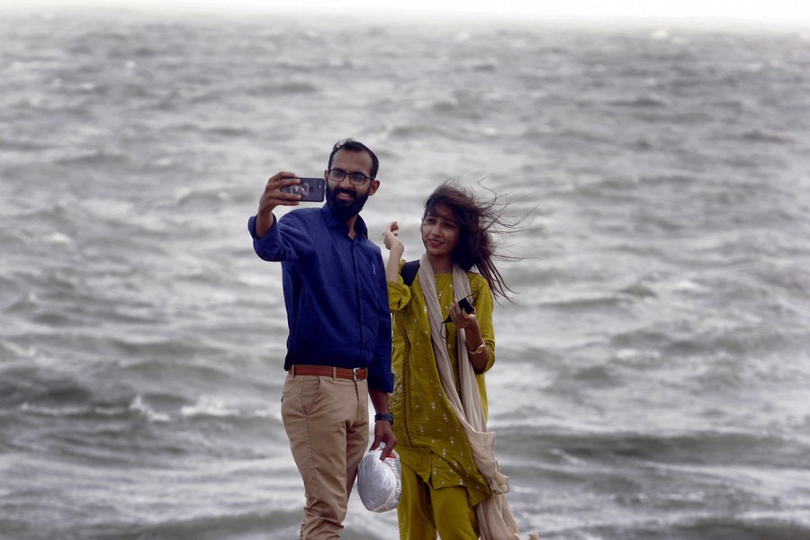 People take photos at a beach ahead of Cyclone Biparjoy in the southern Pakistani port city of Karachi on June 14, 2023. (Str/Xinhua)