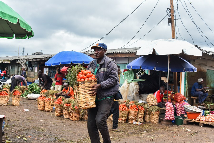 A trader carries tomatoes at a food market in Douala, Cameroon, May 23, 2022. (Photo by Kepseu/Xinhua)