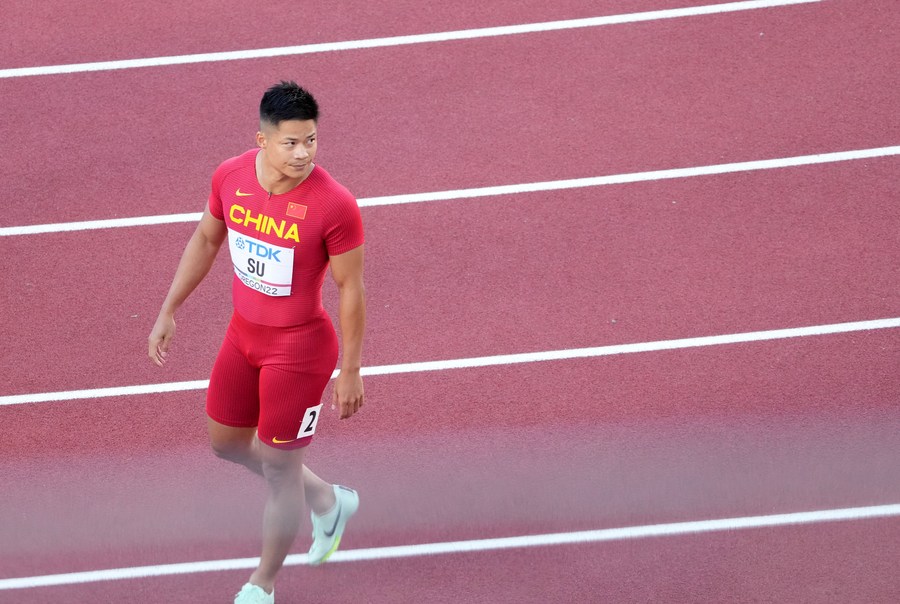 Su Bingtian of China looks on after the men's 100m heat at the World Athletics Championships Oregon22 in Eugene, Oregon, the United States, July 15, 2022. (Xinhua/Wu Xiaoling)