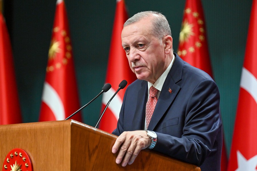 Reelected Turkish President Recep Tayyip Erdogan makes a speech following a cabinet meeting in Ankara, Turkiye on June 14, 2023. (Photo by Mustafa Kaya/Xinhua)