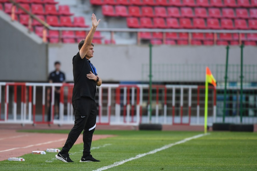 Head coach Pedro Morilla of Wuhan Three Towns gestures during their Chinese Super League (CSL) match against Shanghai Port in Dalian, northeast China's Liaoning Province, June 19, 2022. (Xinhua/Wang Yijie)