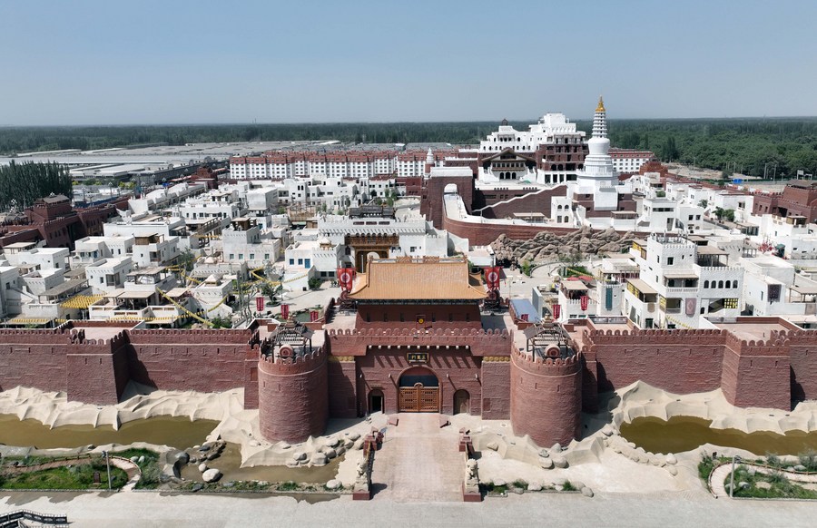 This aerial photo taken on May 17, 2023 shows a view of the Yotkan cultural scenic spot in Hotan County, northwest China's Xinjiang Uygur Autonomous Region. (Xinhua/Zhao Chenjie)