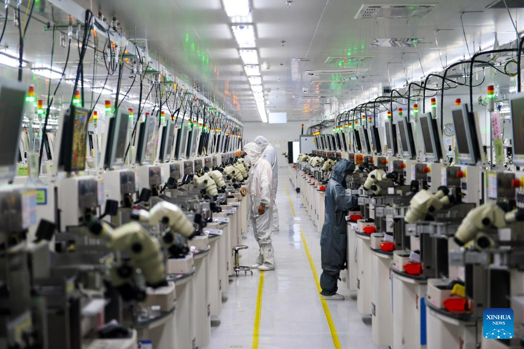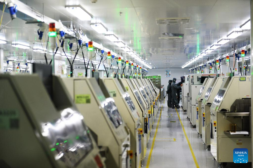 Employees work at an intelligent workshop of Lightning optoelectronic Co., Ltd. in Anxi County of Quanzhou, southeast China's Fujian Province, June 16, 2023. In recent years, Quanzhou has strengthened scientific and technological innovation, and guided enterprises to adopt new technologies and materials to drive high-quality and sustainable development. (Xinhua/Liu Yongzhen)