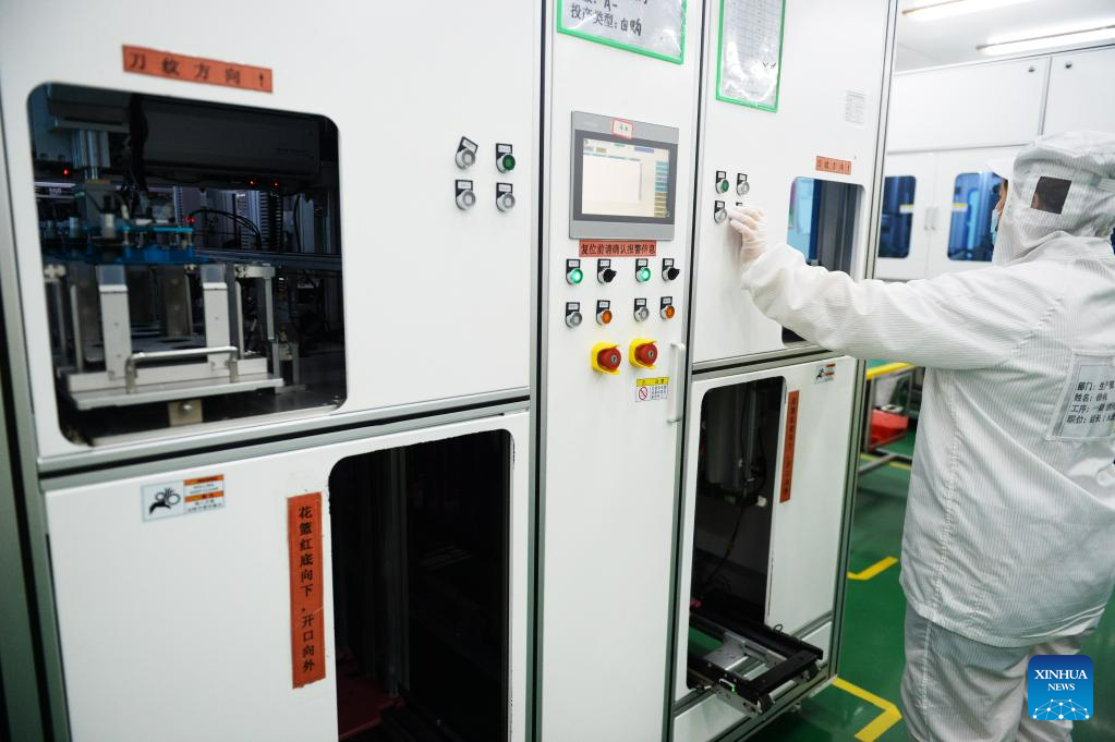 A worker is seen at a solar energy battery workshop of Shine Earth New Energy Co., Ltd. in Nan'an, Quanzhou City, southeast China's Fujian Province, June 17, 2023. In recent years, Quanzhou has strengthened scientific and technological innovation, and guided enterprises to adopt new technologies and materials to drive high-quality and sustainable development. (Xinhua/Liu Yongzhen)