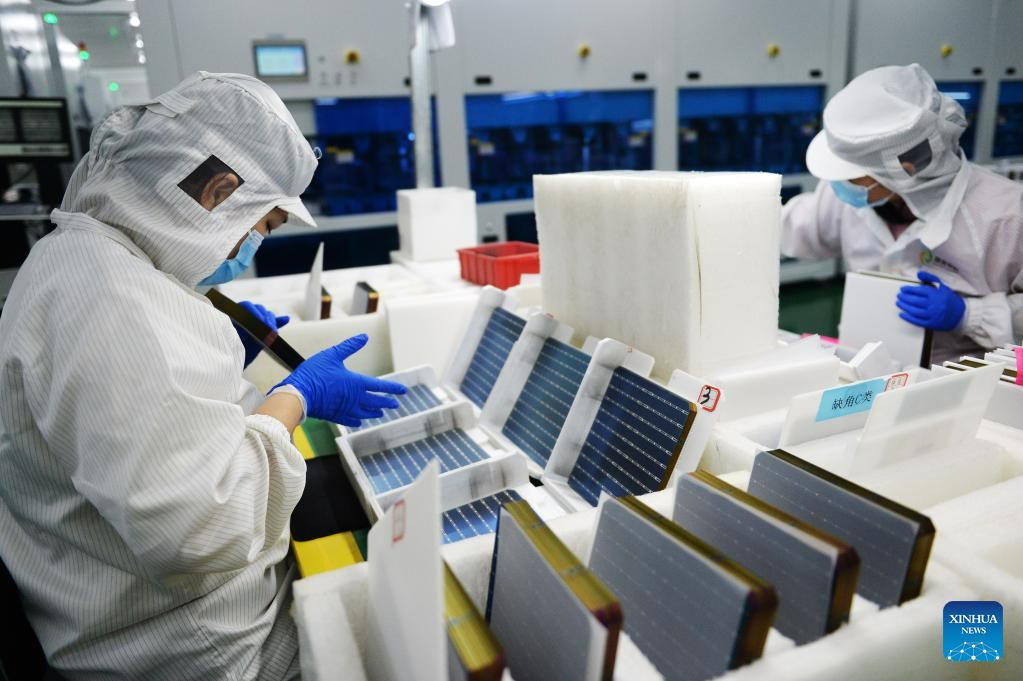 Employees work at a solar energy battery workshop of Shine Earth New Energy Co., Ltd. in Nan'an, Quanzhou City, southeast China's Fujian Province, June 17, 2023. In recent years, Quanzhou has strengthened scientific and technological innovation, and guided enterprises to adopt new technologies and materials to drive high-quality and sustainable development. (Xinhua/Liu Yongzhen)