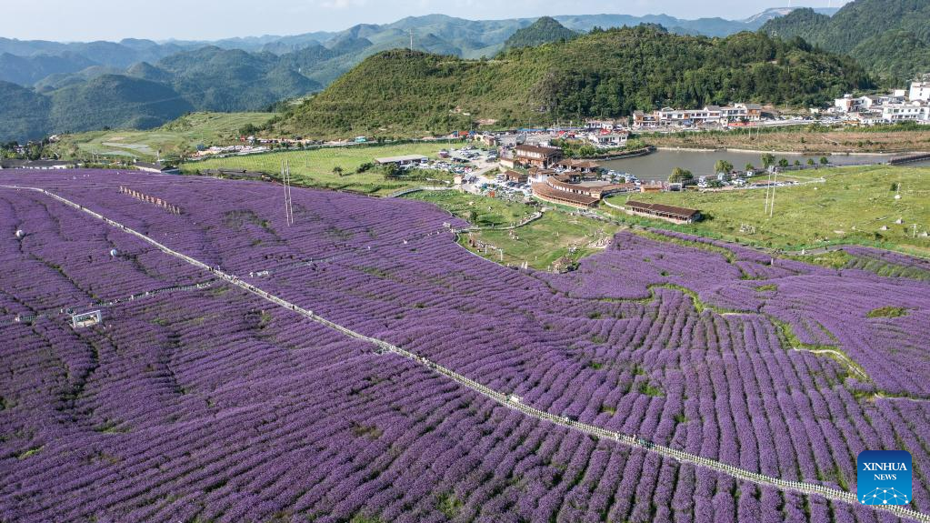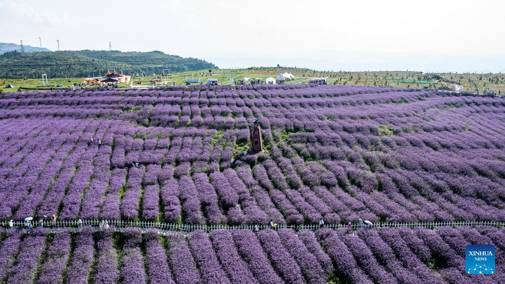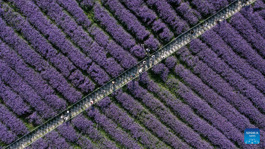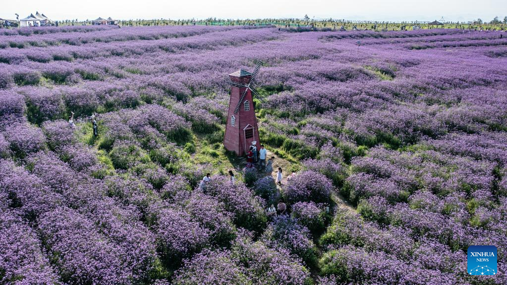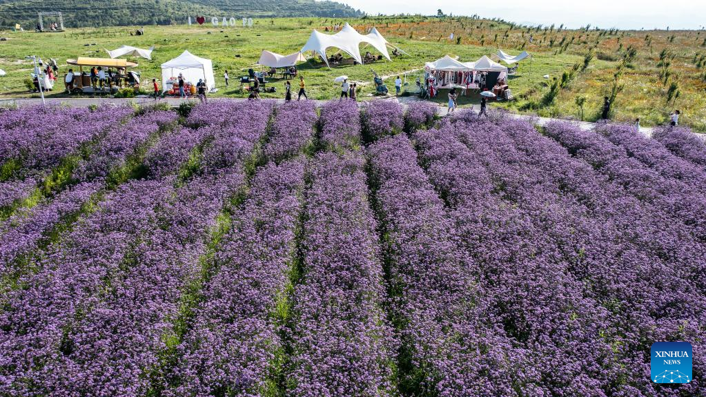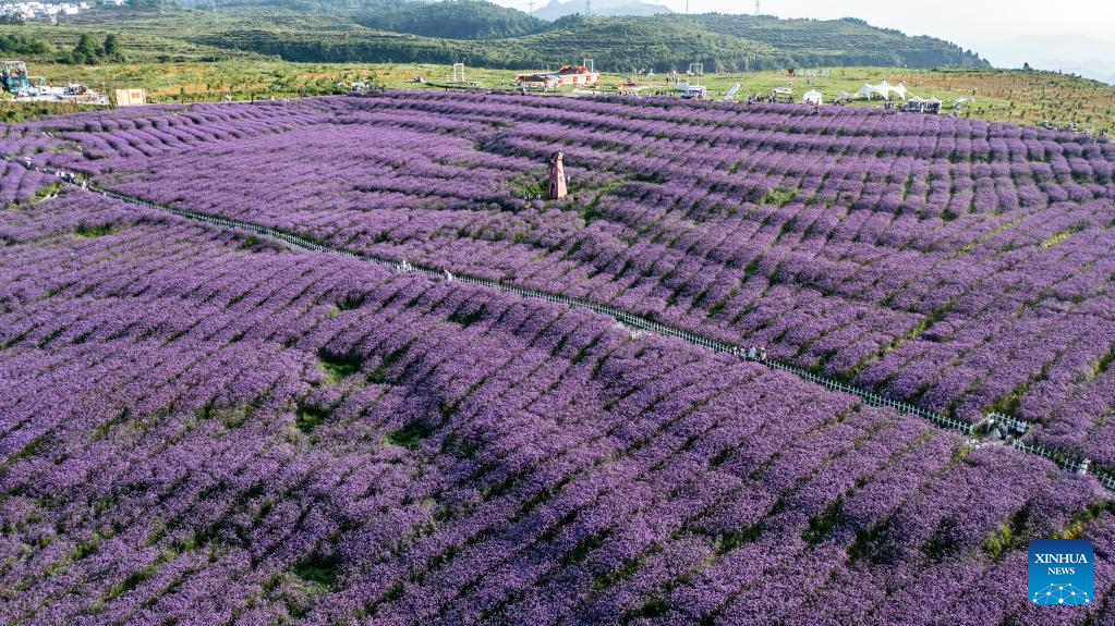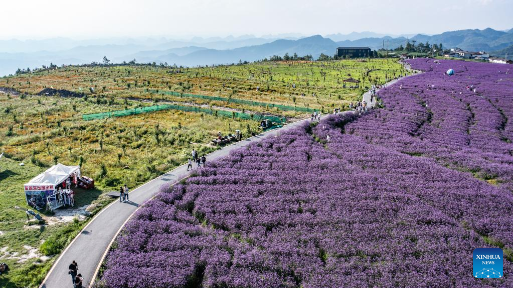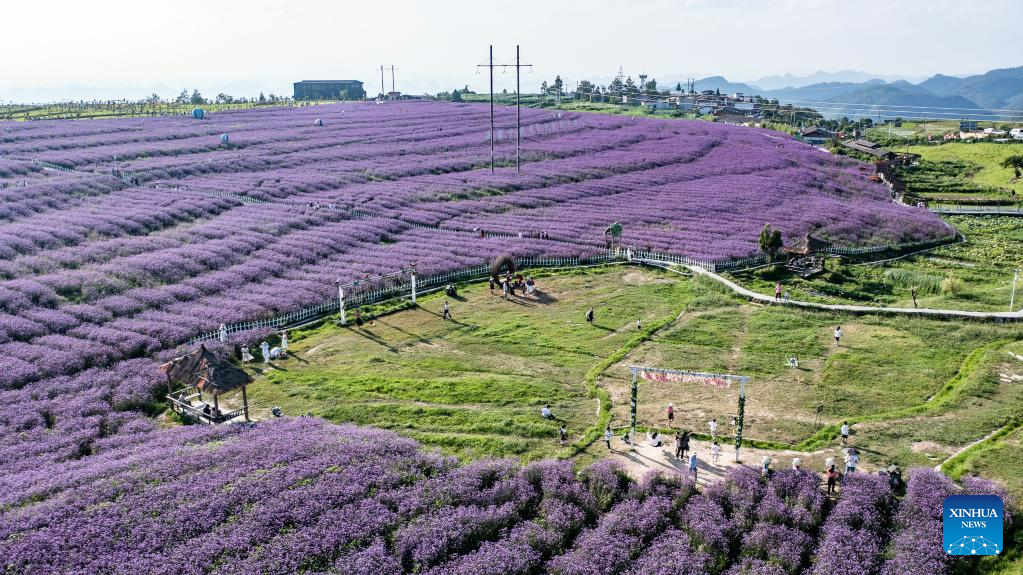 In this aerial photo, tourists enjoy themselves in a verbena field in Gaopo Township of Guiyang, southwest China's Guizhou Province, June 17, 2023. (Xinhua/Tao Liang)