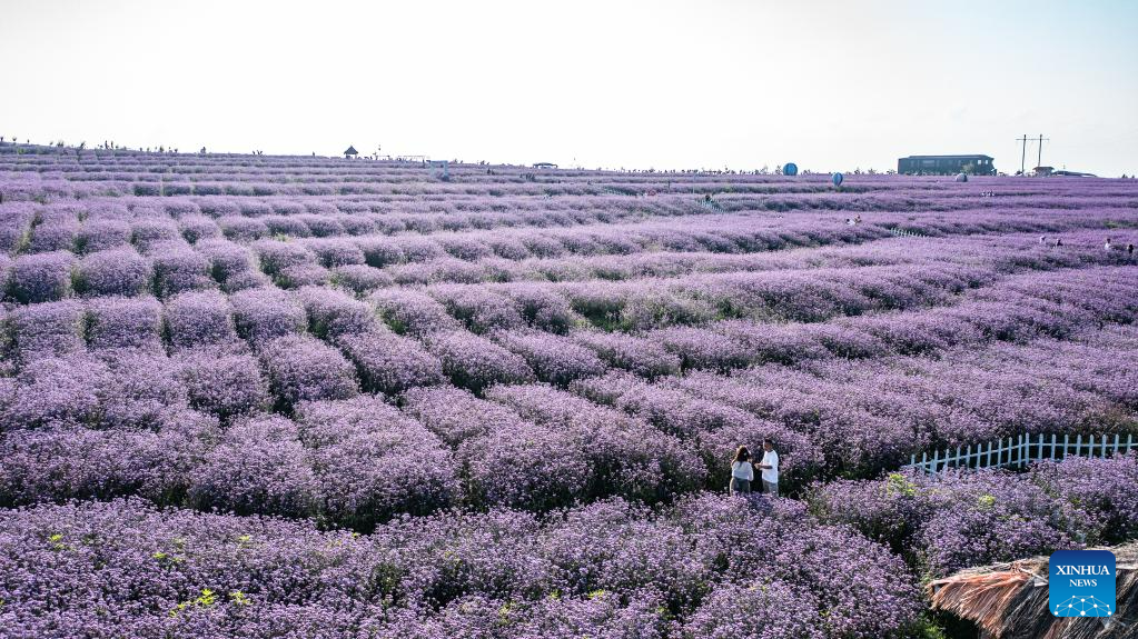 Tourists take photos in a verbena field in Gaopo Township of Guiyang, southwest China's Guizhou Province, June 17, 2023. (Xinhua/Tao Liang)