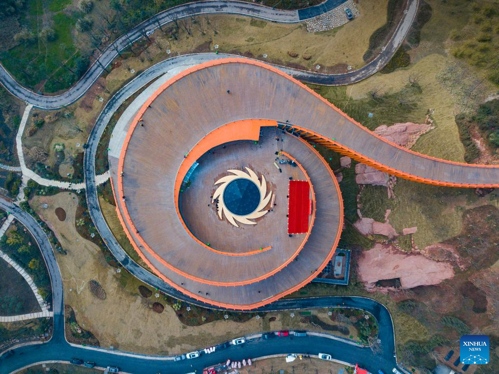 This aerial photo taken on Dec. 31, 2019 shows a view of an observation platform at the Longquanshan city forest park in Chengdu, southwest China's Sichuan Province. Chengdu, a historical city in southwest China's Sichuan Province, is home to treasured cultural and historical sites, including Sanxingdui Ruins, Jinsha Site Museum, and Dujiangyan irrigation system. In recent years, Chengdu has witnessed the rapid development of its cultural and creative industry, showcasing its vitality, creativeness and energy. (Photo by Hu Datian/Xinhua)