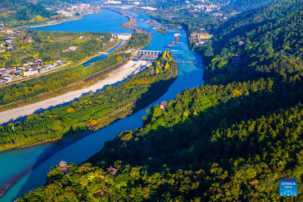 This aerial photo taken on May 7, 2023 shows a view of Dujiangyan in southwest China's Sichuan Province. Chengdu, a historical city in southwest China's Sichuan Province, is home to treasured cultural and historical sites, including Sanxingdui Ruins, Jinsha Site Museum, and Dujiangyan irrigation system. In recent years, Chengdu has witnessed the rapid development of its cultural and creative industry, showcasing its vitality, creativeness and energy. (Photo by He Bo/Xinhua)
