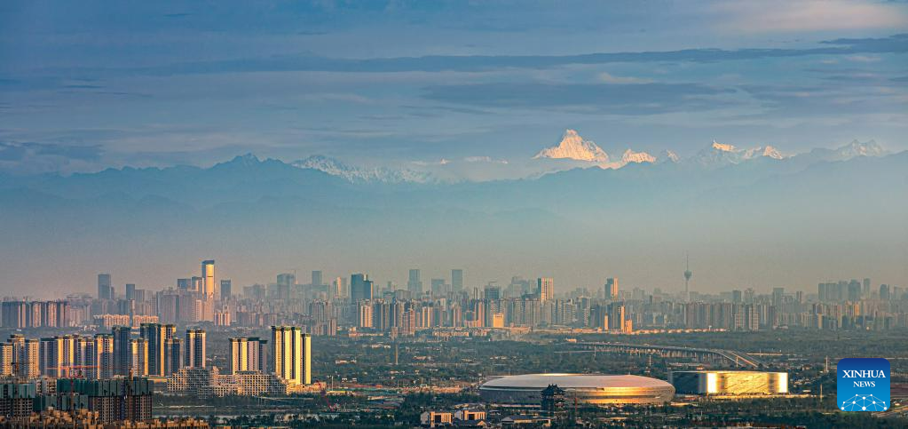 This aerial photo taken on June 4, 2021 shows a view of Chengdu and the snow mountain in the distance in southwest China's Sichuan Province. Chengdu, a historical city in southwest China's Sichuan Province, is home to treasured cultural and historical sites, including Sanxingdui Ruins, Jinsha Site Museum, and Dujiangyan irrigation system. In recent years, Chengdu has witnessed the rapid development of its cultural and creative industry, showcasing its vitality, creativeness and energy. (Photo by Shen Jun/Xinhua)