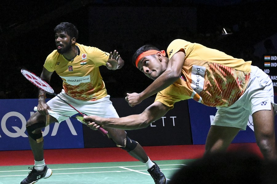 Satwiksairaj Rankireddy/Chirag Shetty(R) of India compete in the men's doubles final against Aaron Chia/Soh Wooi Yik of Malaysia at Indonesia Open 2023 in Jakarta, June 18, 2023. (Xinhua/Veri Sanovri)
