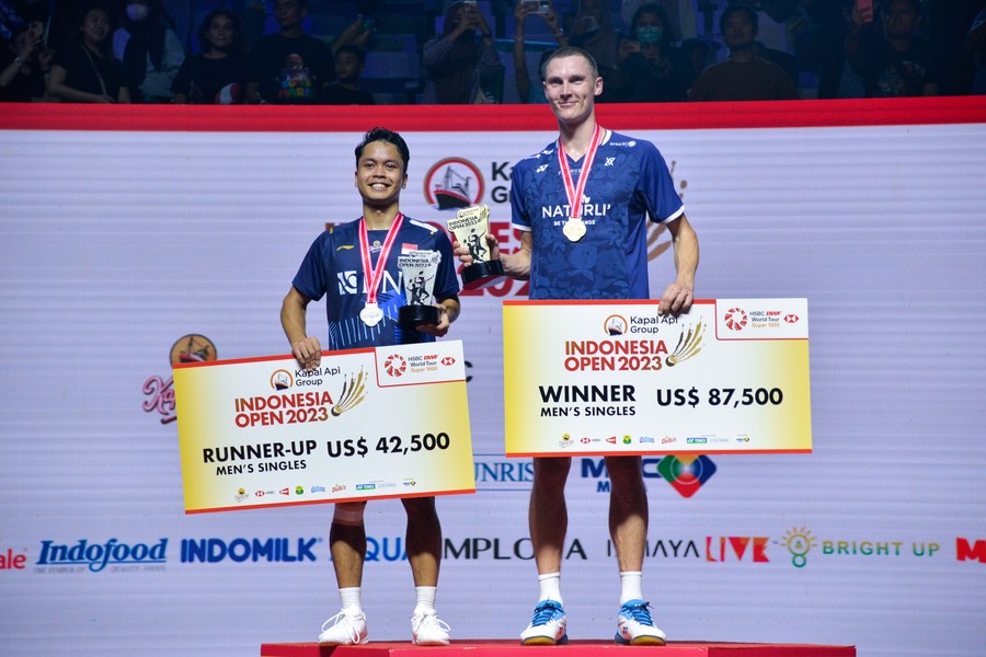 Viktor Axelsen (R) of Denmark and Anthony Sinisuka Ginting of Indonesia pose for photos on the podium after the men's singles final at Indonesia Open 2023 in Jakarta, June 18, 2023. (Xinhua/Xu Qin)