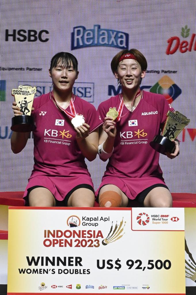 Baek Ha-na (L) /Lee So-hee of South Korea pose for photos during the awarding ceremony after the women's doubles final against Fukushima Yuki/Hirota Sayaka of Japan at Indonesia Open 2023 in Jakarta, June 18, 2023. (Xinhua/Veri Sanovri)