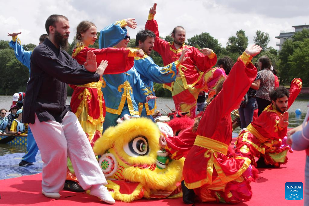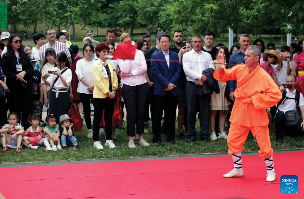 A Romanian demonstrates his Shaolin Kungfu skills during the first China-Romania Dragon Boat Friendship Race in Bucharest, capital of Romania, June 18, 2023. The China-Romania dragon boat friendship race to celebrate the Chinese Dragon Boat Festival was held on Sunday at Bordei Lake in the northern suburbs of Bucharest, the Romanian capital.