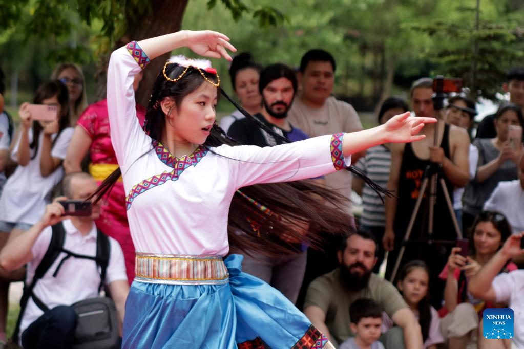 A member of a Chinese community in Romania performs a traditional dance during the first China-Romania Dragon Boat Friendship Race in Bucharest, capital of Romania, June 18, 2023. The China-Romania dragon boat friendship race to celebrate the Chinese Dragon Boat Festival was held on Sunday at Bordei Lake in the northern suburbs of Bucharest, the Romanian capital.
