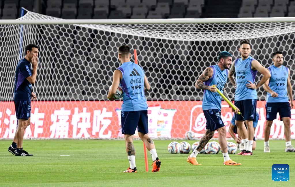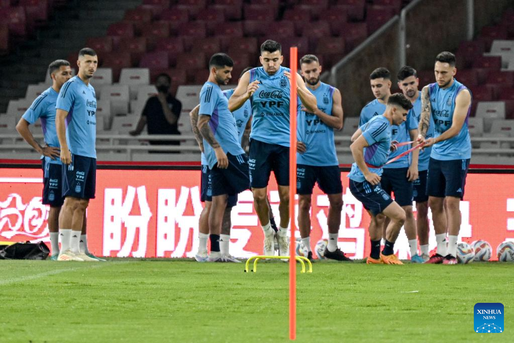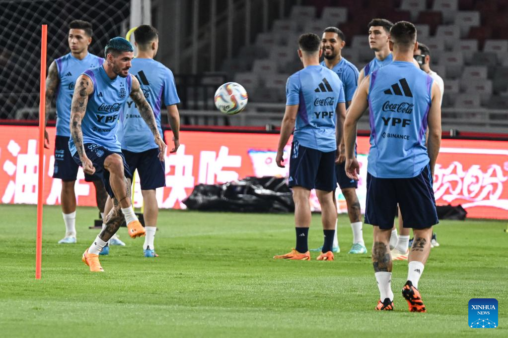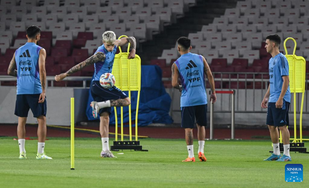 Players of Team Argentina warm up during a training session at Gelora Bung Karno Stadium in Jakarta, Indonesia on June 18, 2023. (Xinhua/Agung Kuncahya B.)