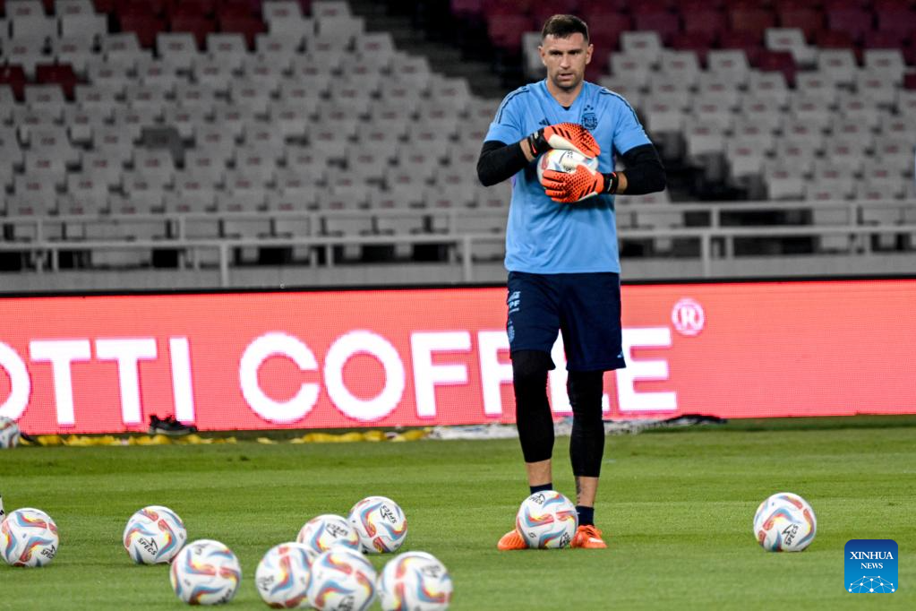 Emiliano Martinez of Team Argentina attends a training session at Gelora Bung Karno Stadium in Jakarta, Indonesia on June 18, 2023. (Xinhua/Agung Kuncahya B.)