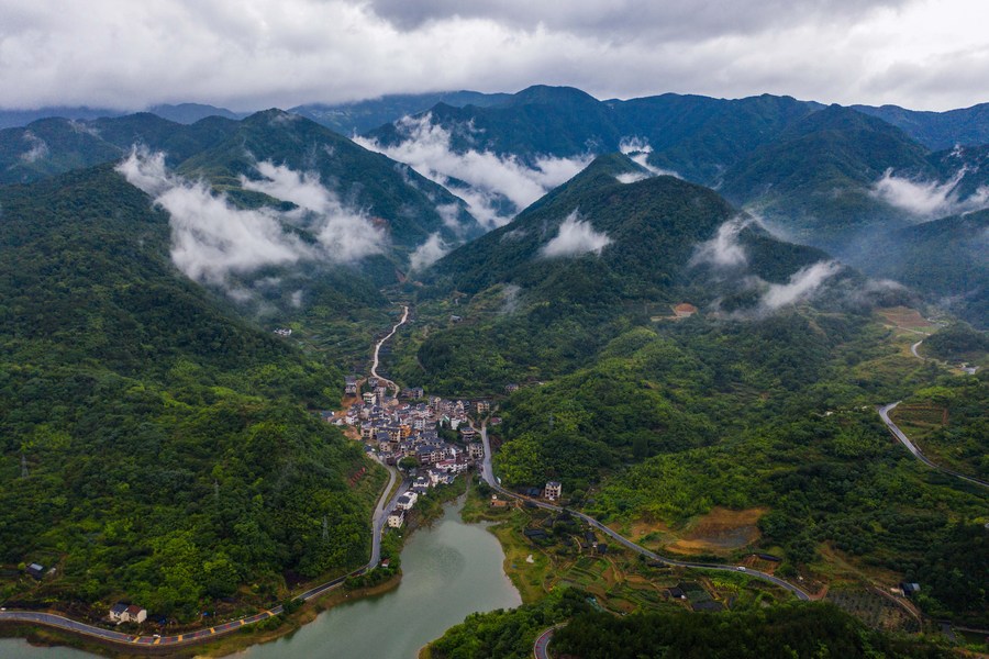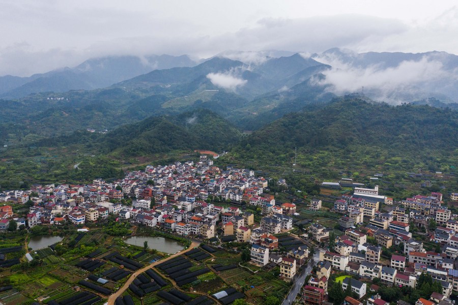 This aerial photo taken on June 20, 2023 shows a view of Beishankou Village of Chisong Town in Jindong District of Jinhua City, east China's Zhejiang Province. (Xinhua/Xu Yu)